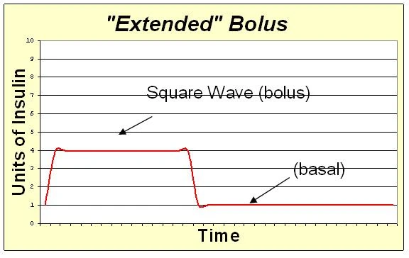 An extended bolus is a slow infusion of insulin spread out over time. By pumping with a "square wave" shape, the bolus avoids a high initial dose of insulin that may enter the blood and cause low blood sugar before digestion can facilitate sugar entering the blood. The extended bolus also extends the action of insulin well beyond that of the insulin alone. The extended bolus is appropriate when covering high fat high protein meals such as steak, which will be raising blood sugar for many hours past the onset of the bolus. The extended bolus is also useful for those with slow digestion (such as with gastroparesis or Coeliac disease).