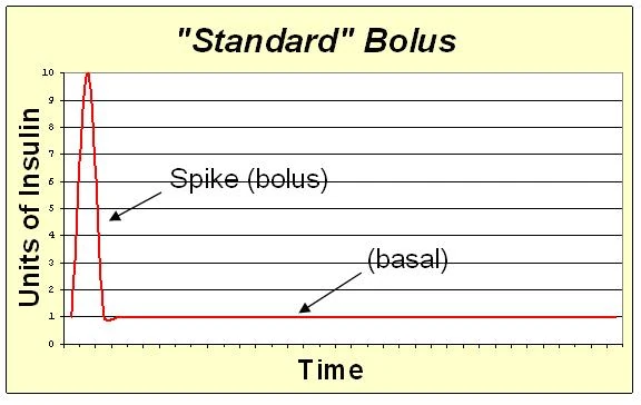 A standard bolus is an infusion of insulin pumped completely at the onset of the bolus. It is most similar to an injection. By pumping with a "spike" shape, the expected action is the fastest possible bolus for that type of insulin. The standard bolus is most appropriate when eating high carb low protein low fat meals because it will return blood sugar to normal levels quickly.